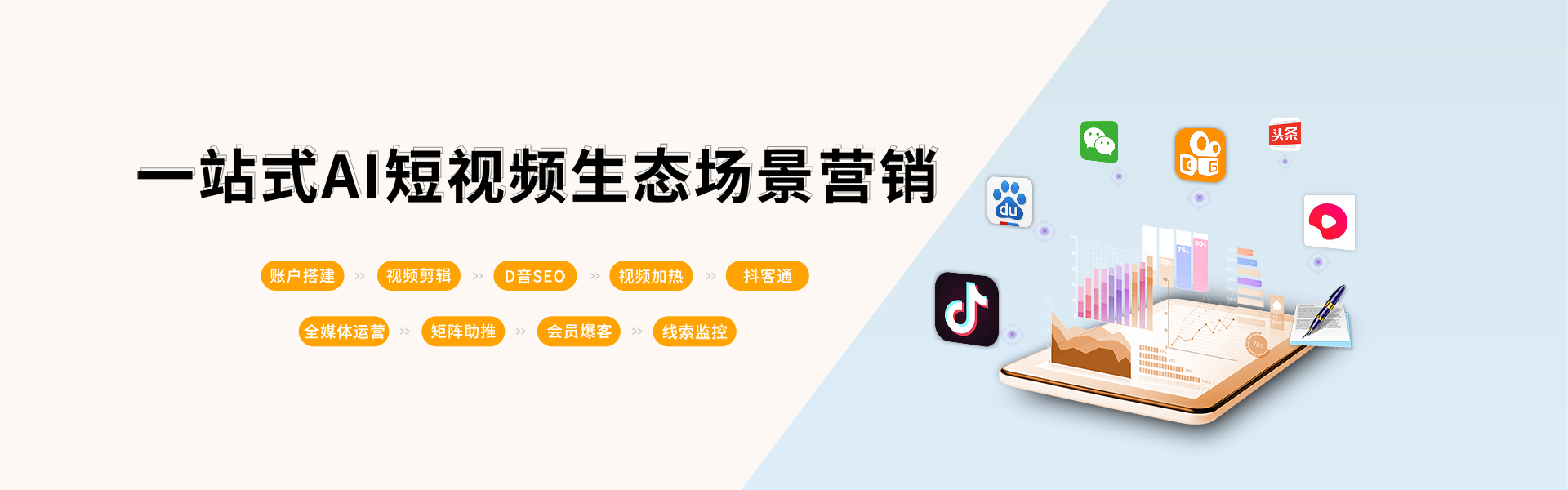 4、全媒体运营:打通抖音、快手、百家号等多个头部平台,视频全网分发,多场景视频流量全网获取;